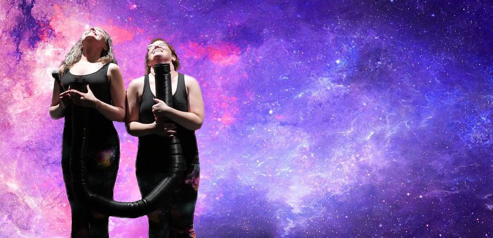 Spacepants is Jennifer Beattie and Diana Wade. While singing (Jen) and playing viola (Diana) at a music festival in Vermont, we met, realized we shared a life-long dream of wearing as many sparkles as possible, and ran joyfully out into a field to celebrate. Our enthusiasm attracted the attention of some rad aliens who invited us to party and jam with them. As luck would have it, they were having a full-on sparkle party. When we woke up the next day, groggy and disoriented, we discovered the rad aliens had left us three parting gifts: a 25-foot long tube, a mission, and several pairs of spacepants. The tube would of course become a central focus of our music-making. The mission, which we accepted, is to wear spacepants while bringing both our own and other earth-bound beings’ works of music, poetry, multi-media, storytelling and art to life.